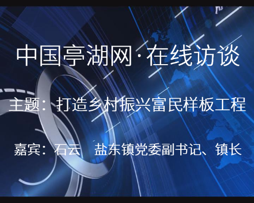[主持人]各位网友大家好!欢迎收看中国亭湖网在线访谈,这次访谈的主题是:全力打造乡村振兴富民样板工程。今天我们很高兴地邀请到了盐东镇党委副书记、镇长石云做客访谈,与大家畅谈深入实施乡村振兴战略,切实打造富民样板工程。欢迎石镇长!