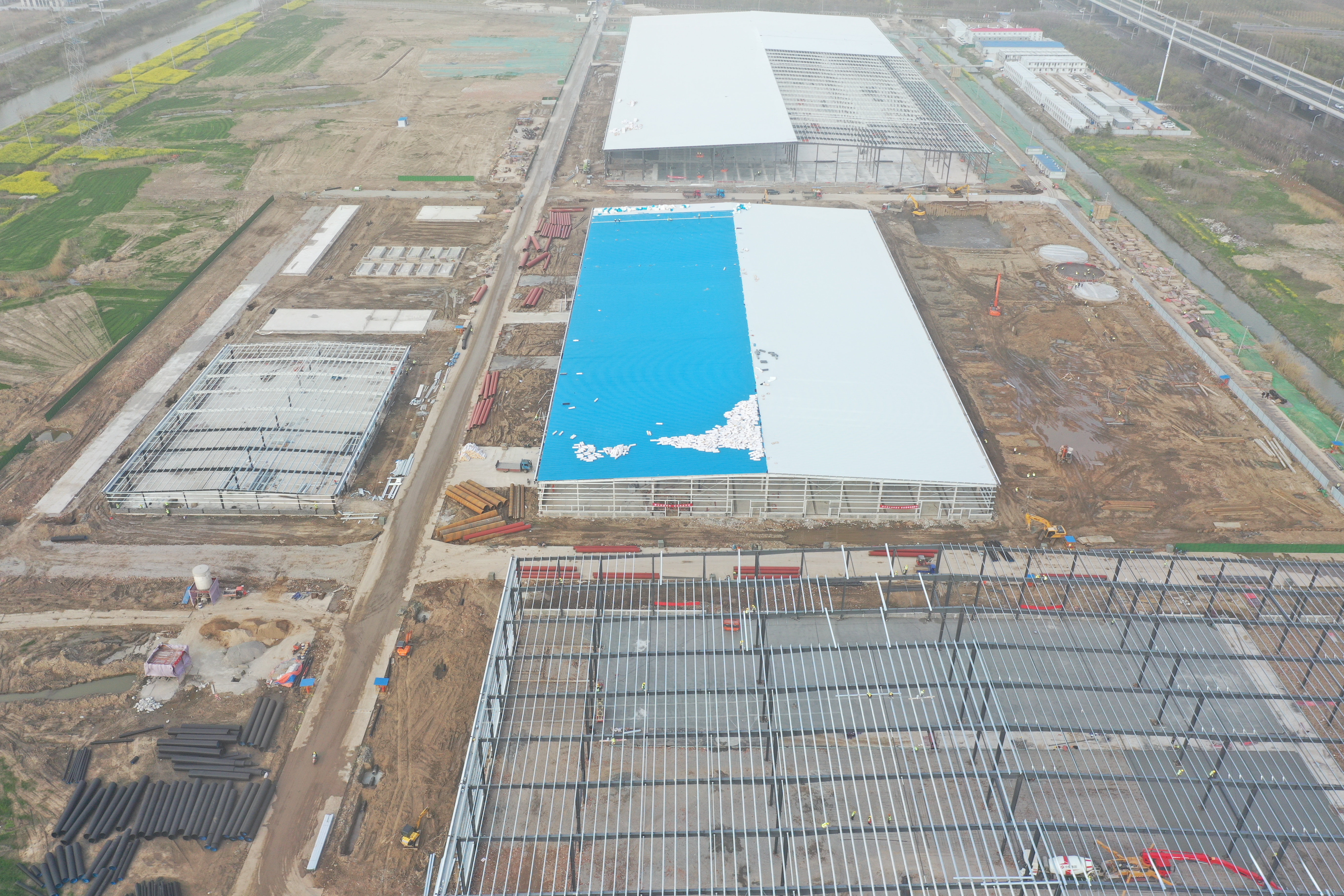 天合16GW电池及10GW组件项目现场,人声鼎沸、机器轰鸣。偌大的施工场地上钢架林立,工人们正在大型机械的辅助下搭建厂房钢架结构。