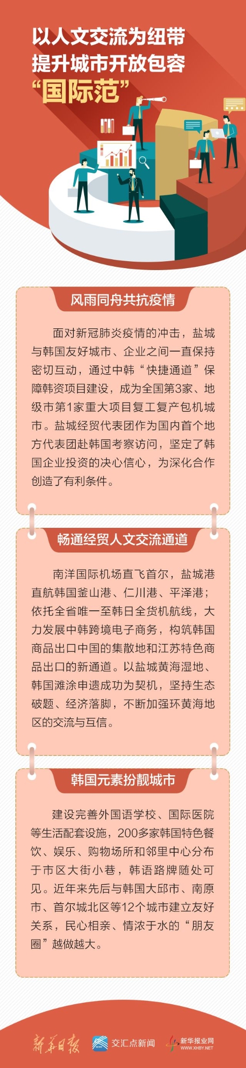 韩国元素扮靓城市。面对1万多名韩国人常年在盐城生活的实际需求,建设完善外国语学校、国际医院等生活配套设施,200多家韩国特色餐饮、娱乐、购物场所和邻里中心分布于市区大街小巷,韩语路牌随处可见。近年来先后与韩国大邱市、南原市、首尔城北区等12个城市建立友好关系,民心相亲、情浓于水的“朋友圈”越做越大。